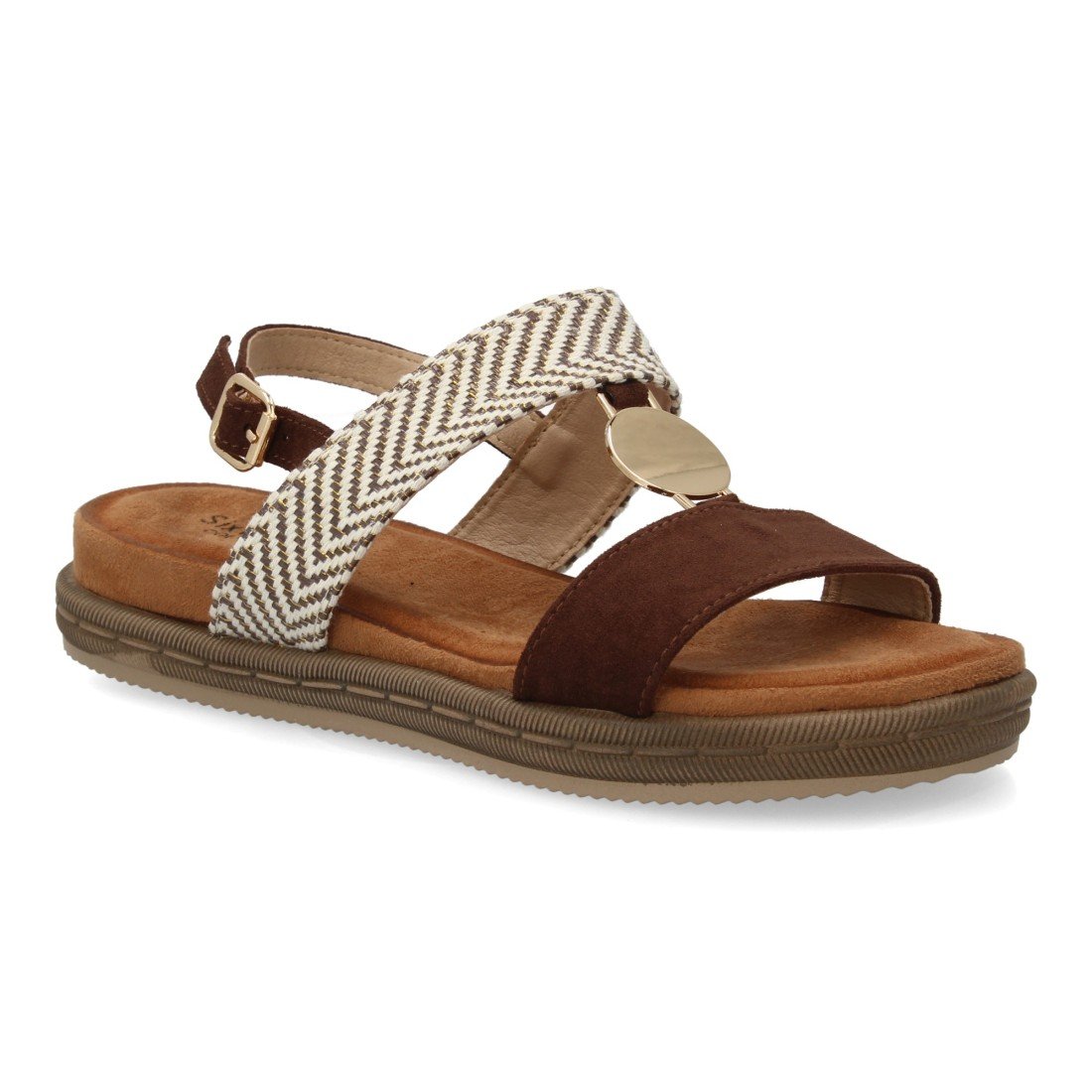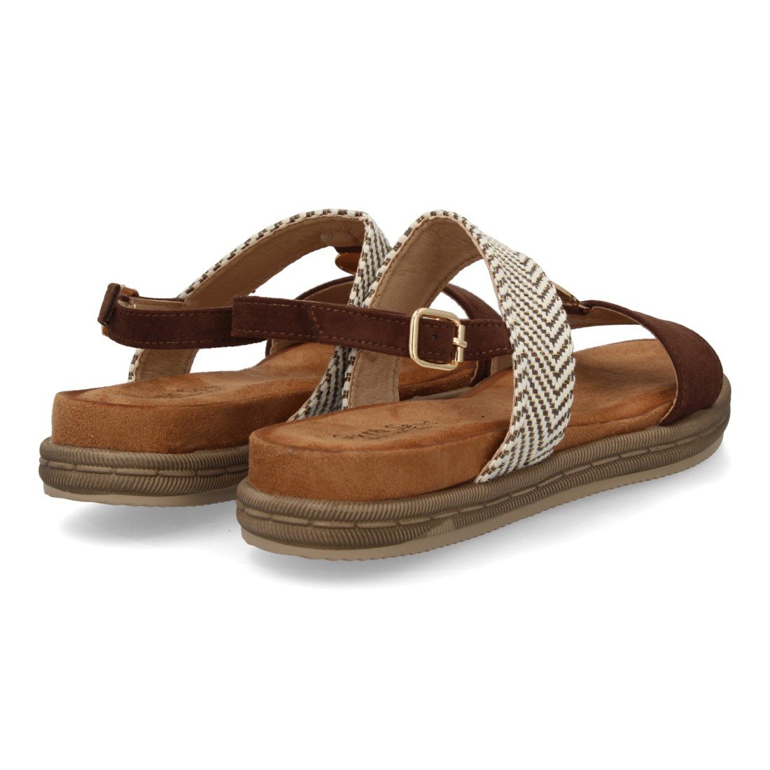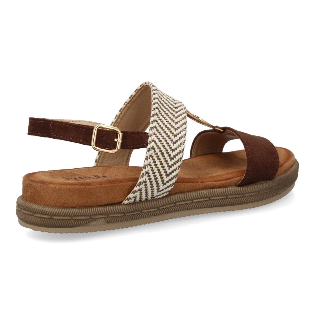 Sandalia mujer con diseño de doble tira y diferentes texturas, suela ergonómica, plana y ligera, para el día a día, temporada de verano. Adorno metálico y cierre de hebilla.