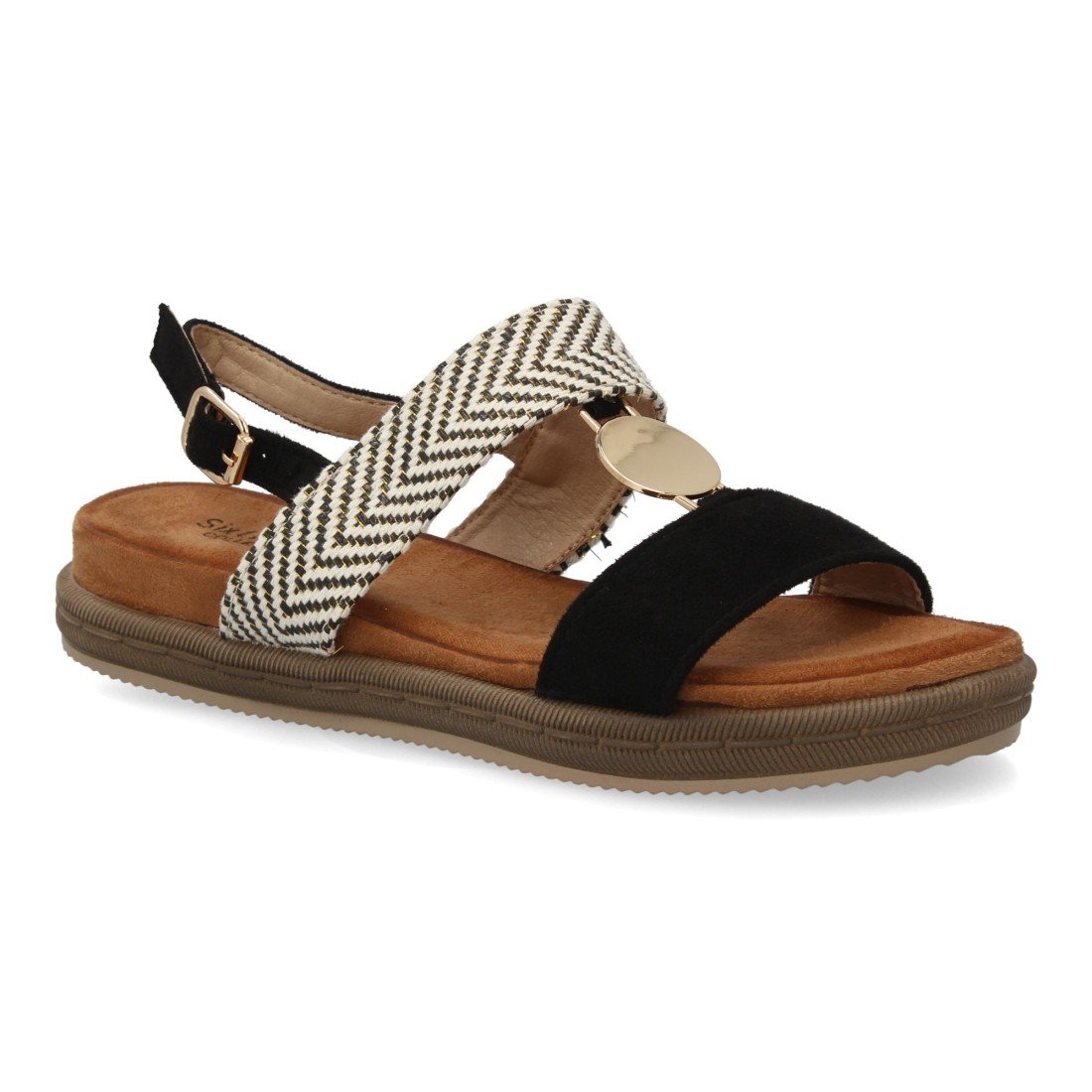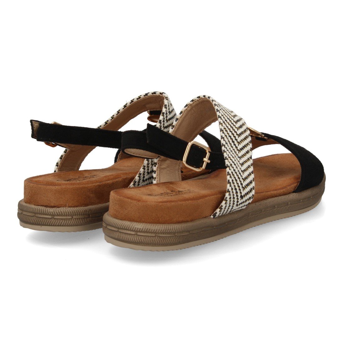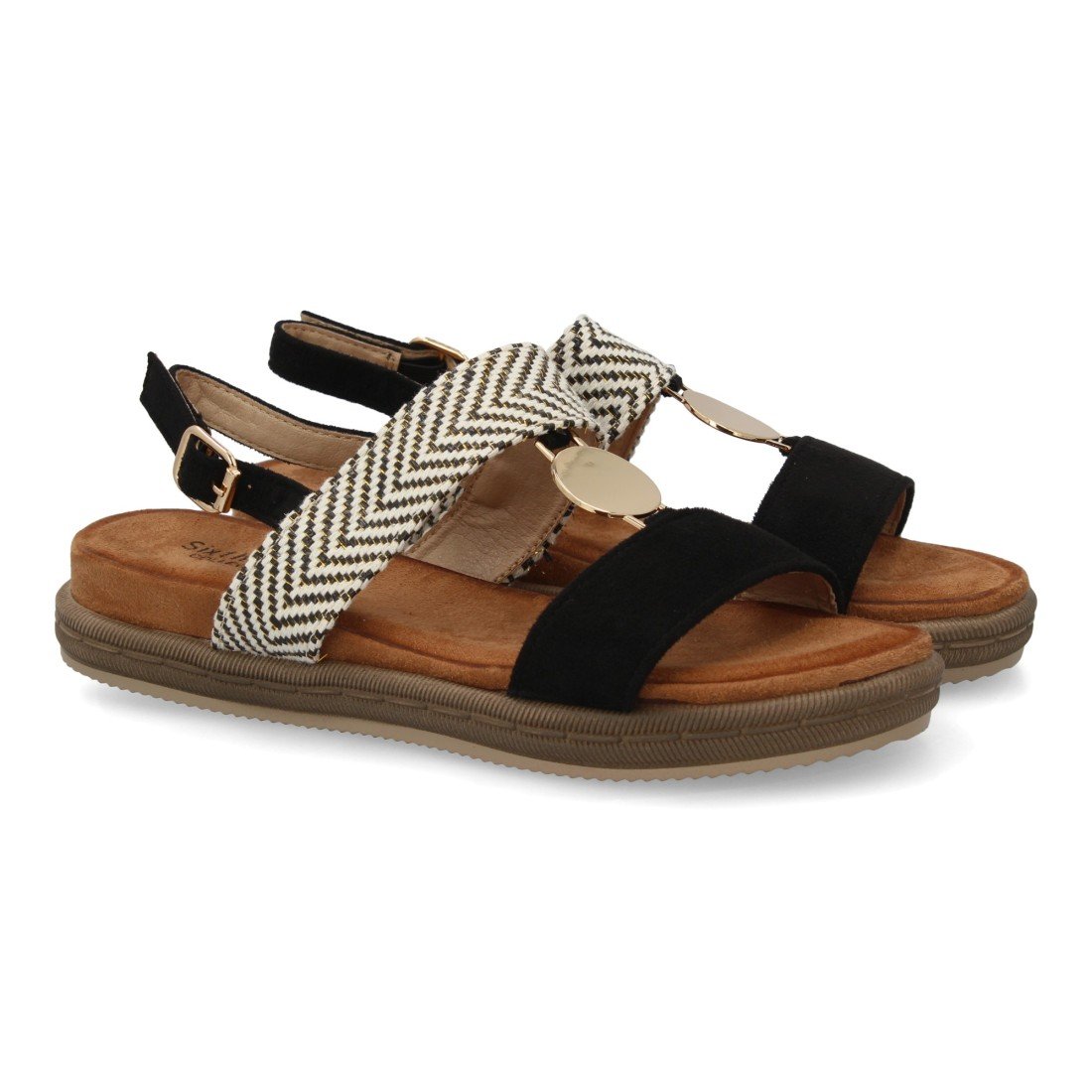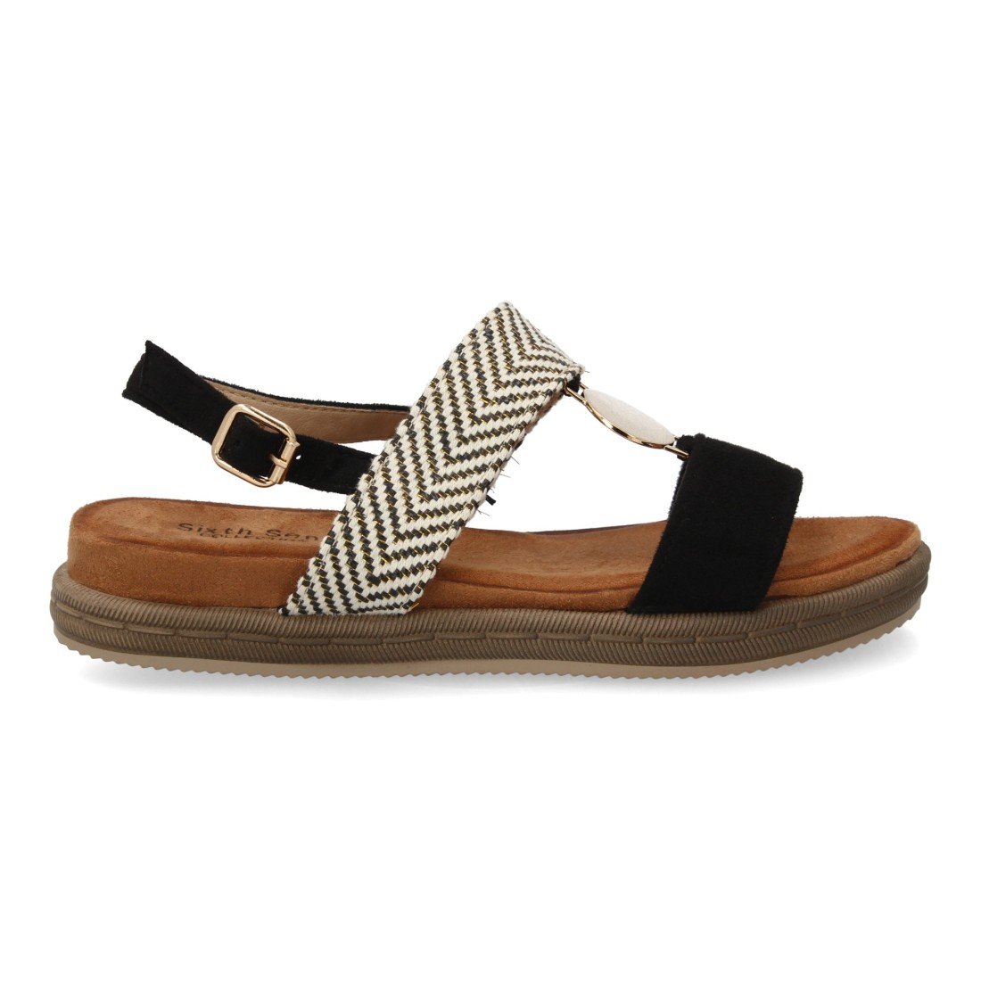 Sandalia mujer con diseño de doble tira y diferentes texturas, suela ergonómica, plana y ligera, para el día a día, temporada de verano. Adorno metálico y cierre de hebilla.