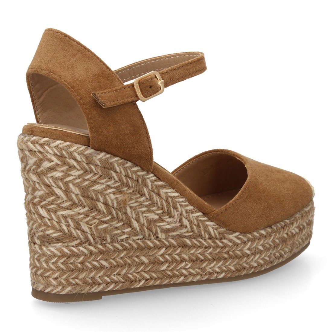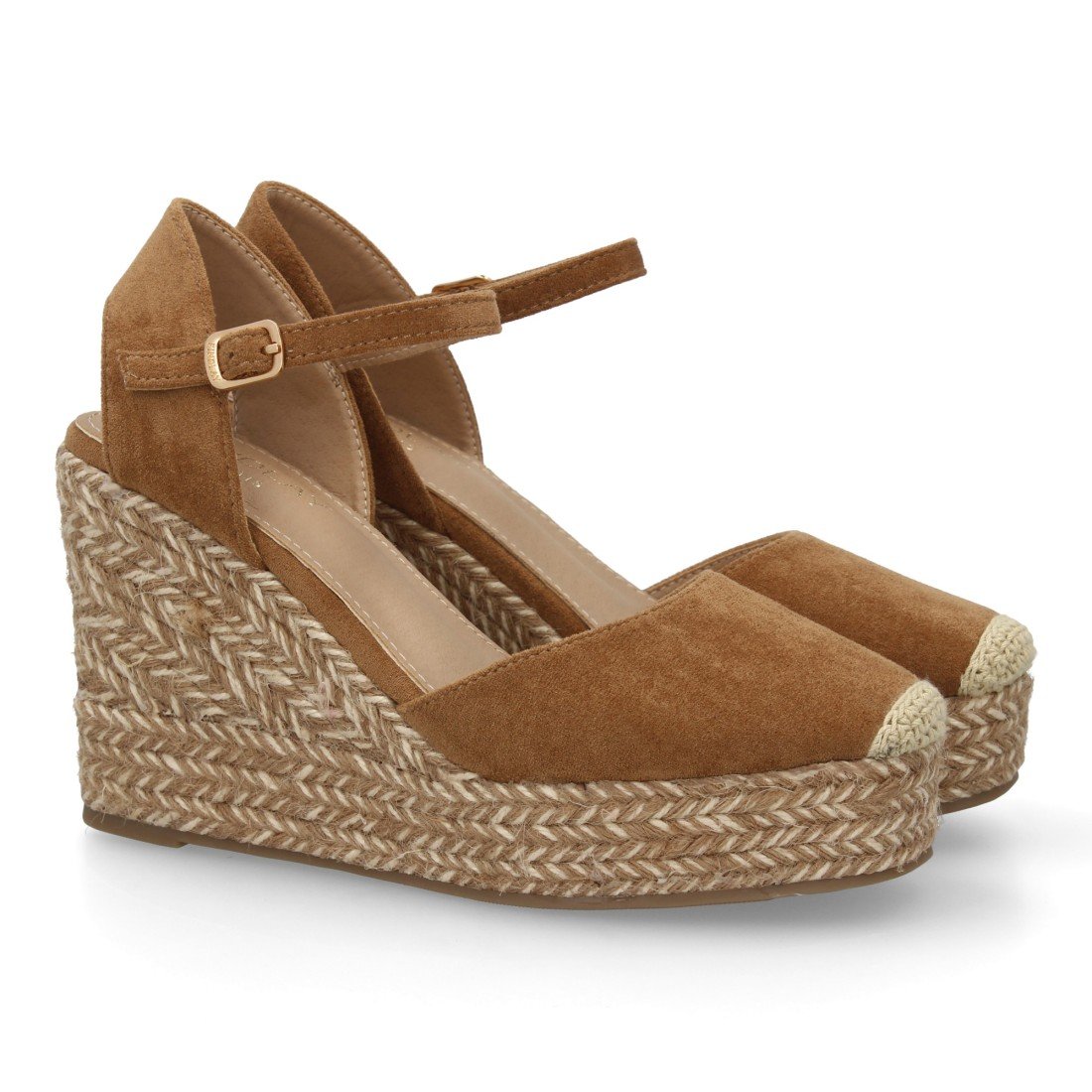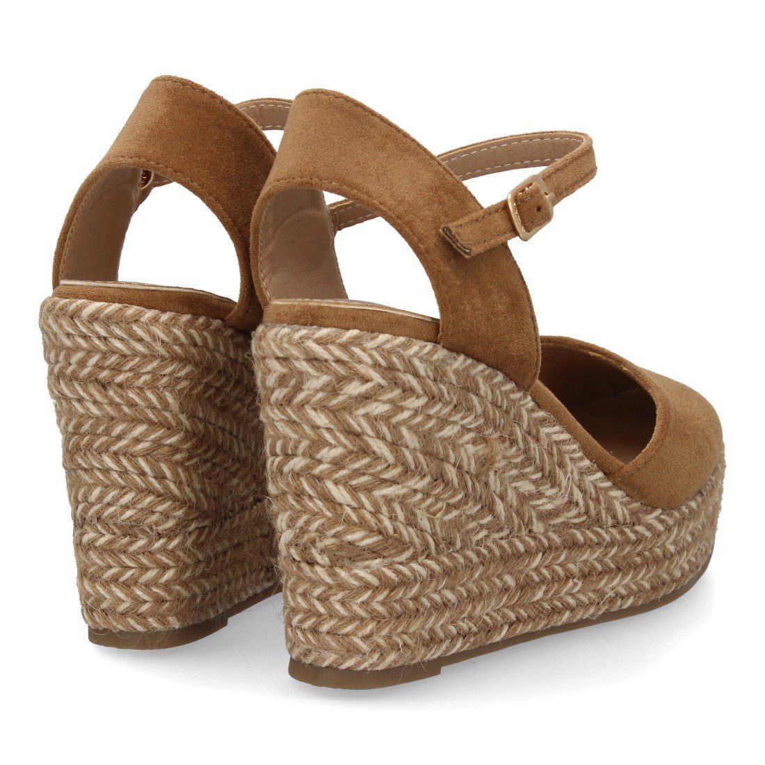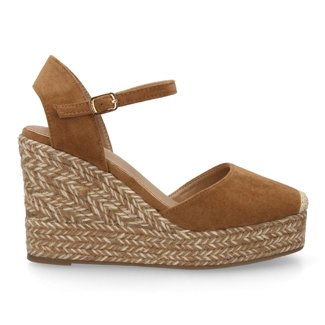 Sandalia alpargata para mujer con cuña de yute bitono, punta cerrada. Cierre ajustable de hebilla en el tobillo. Suela de esparto