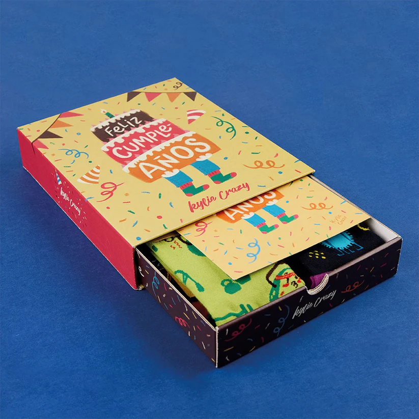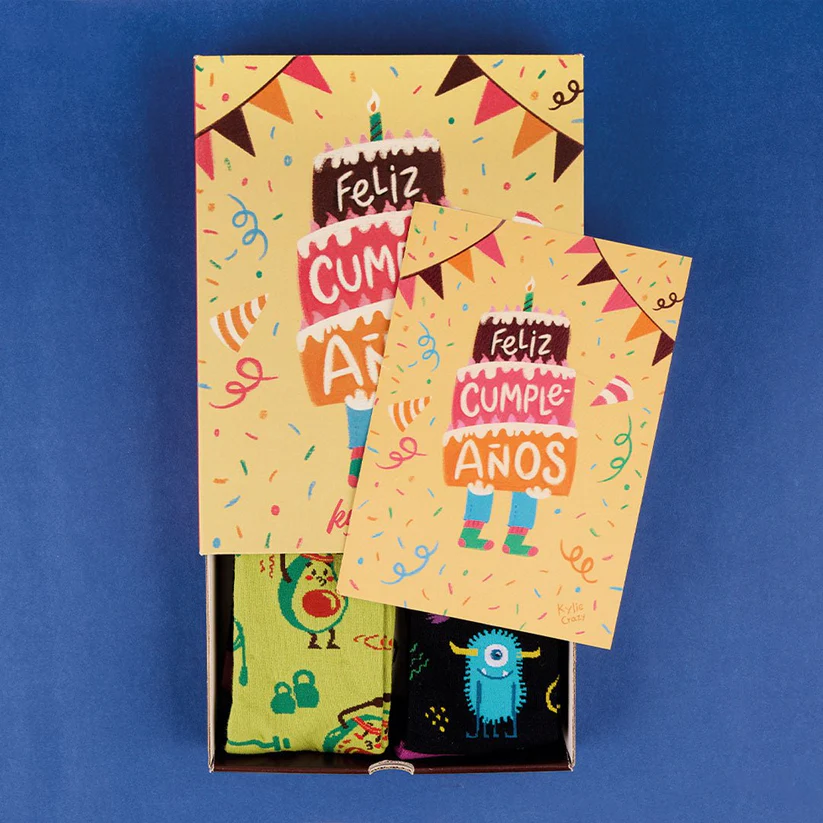 El combo más alegre del universo: 4 calcetines divertidos + print de “Feliz Cumpleaños” en una presentación tan original que roba sonrisas al instante.
