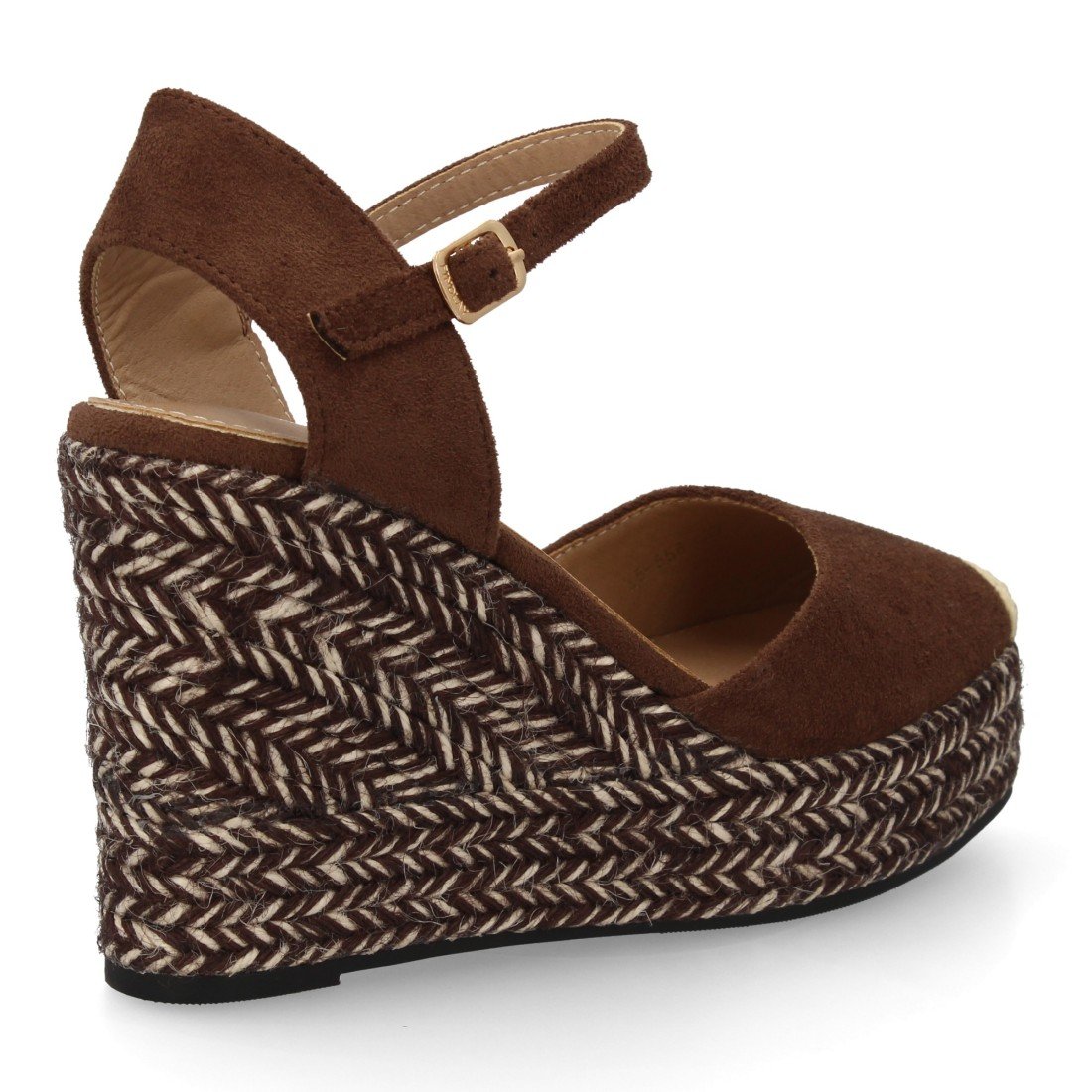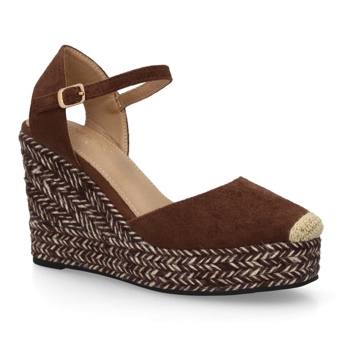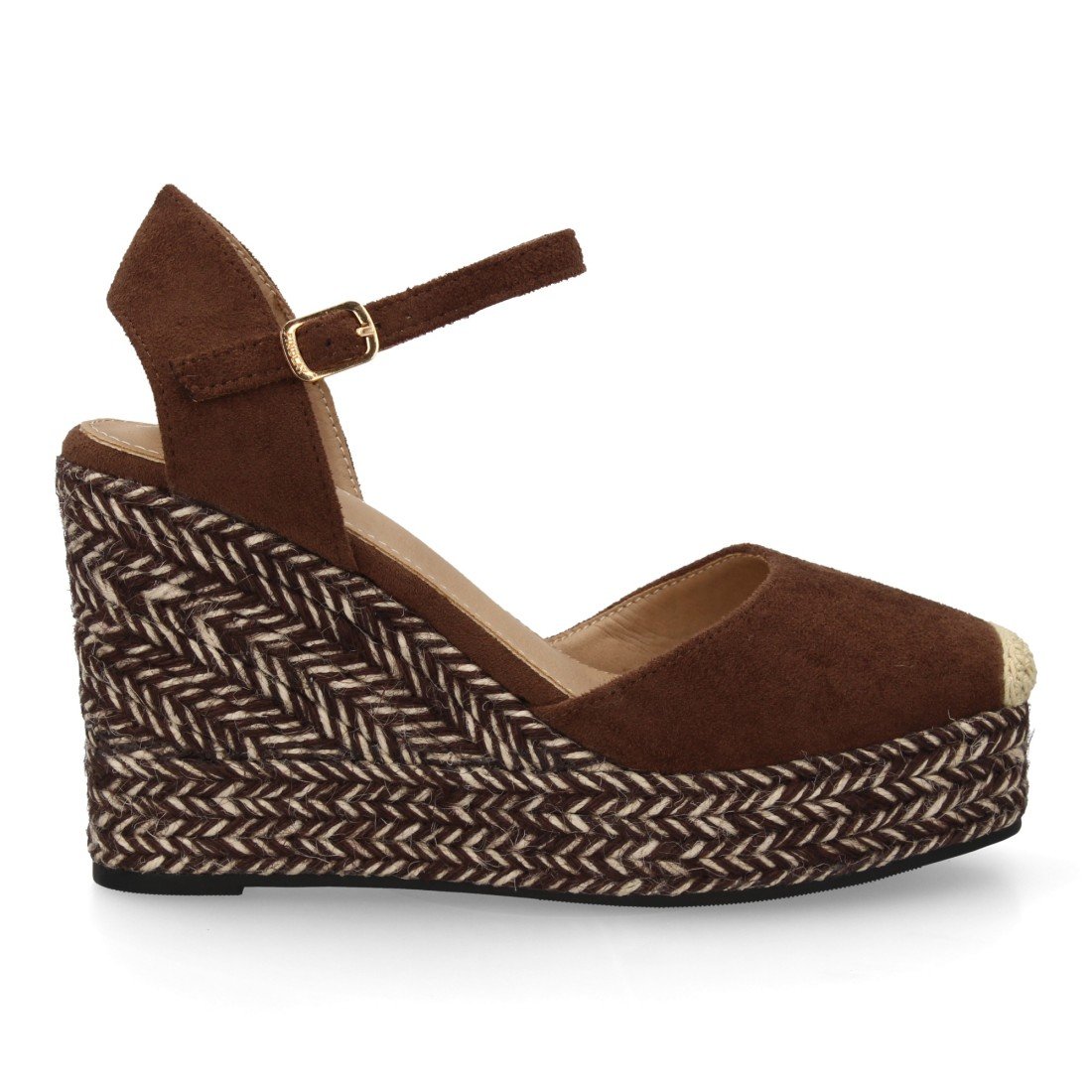Sandalia alpargata para mujer con cuña de yute bitono, punta cerrada. Cierre ajustable de hebilla en el tobillo. Suela de esparto